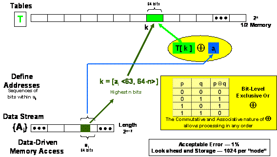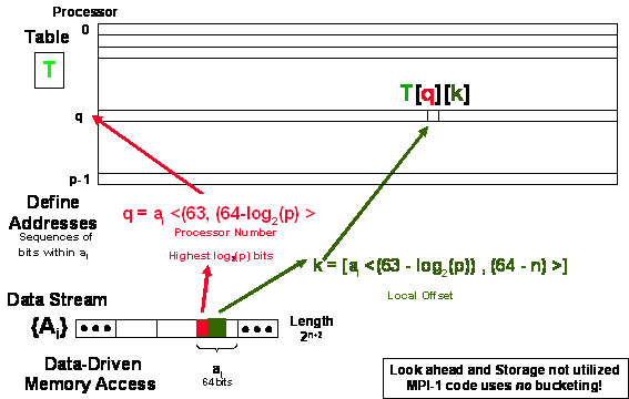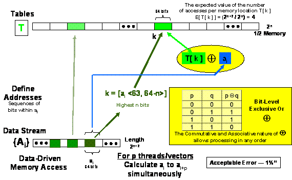 The parameter n is defined such that: Constraints on the look ahead and storage before processing on distributed memory multi-processor systems is limited to 1024 per process. Operations performed in parallel (either due to look ahead or process parallelization) are allowed to be "unlocked" and therefore may result in a small percentage of updates being left unperformed due to race conditions. (If two parallel operations read the same location, update the value, and then each store the resulting values -- one update is lost.) This percentage may not exceed 1%. The basic RandomAccess definition is described graphically in Figure 3. ![]() Figure 3. RandomAccess Description HPC Challenge RandomAccess TestsRandomAccess will be run in three variants: