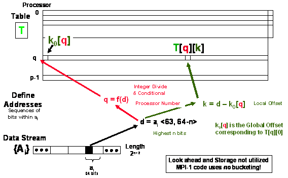 ![]() Figure 4. Sequential RandomAccess Implementation ![]() Figure 5. Vector or Multi-Threaded RandomAccess Implementation ![]() Figure 6. MPIRandomAccess Power of Two Case Implementation ![]() Figure 7. MPIRandomAccess Non-Power of Two Case Implementation The Supplied MPI-1 RandomAccess CodeThe supplied MPI-1 code generates the input stream {Ai} on all processors and the global table has been distributed as uniformly as possible to balance the workload and minimize any Amdahl fraction. This code does exploit "look-ahead". Addresses are sent to the appropriate processor where the table entry resides as soon as each address is calculated. Updates are performed as addresses are received. Each message is limited to a single 64 bit long integer containing element ai from {Ai}. Local offsets for T[ ] are extracted by the destination processor. If the number of processors is equal to a power of two, then the global table can be distributed equally over the processors. In addition, the processor number can be determined from that portion of the input stream that identifies the address into the global table by masking off log2(p) bits in the address -- ai <63, (64-log2(p)), >. If the number of processors is not equal to a power of two, then the global table cannot be equally distributed between processors. In the MPI-1 implementation provided, there has been an attempt to minimize the differences in workloads and the largest difference in elements of T[ ] is one. The number of values in the input stream generated by each processor will be related to the number of global table entries on each processor. The MPI-1 version of RandomAccess treats the potential instance where the number of processors is a power of two as a special case, because of the significant simplifications possible because processor location and local offset can be determined by applying masks to the input stream values. The non power of two case uses an integer division to determine the processor location. The integer division will be more costly in terms of machine cycles to perform than the bit masking operations. Optimizing RandomAccessWhile it will be mandatory to run the HPC Challenge Benchmark code distribution -- including the MPI-1 RandomAccess version -- we encourage users to modify any of the kernels to optimize them for your architecture, software, middleware, and interprocessor features. The supplied UPC codes may be the basis for architecture-dependent optimized RandomAccess runs. Potential modifications to RandomAccess include, but are not limited to: